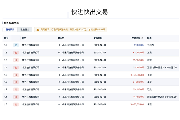 分析信贷项目的核心交易对手,并支持对手方合并操作挖掘潜在风险,多维度查找快进快出等风险交易,全面谨防资金舞弊风险